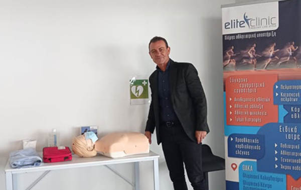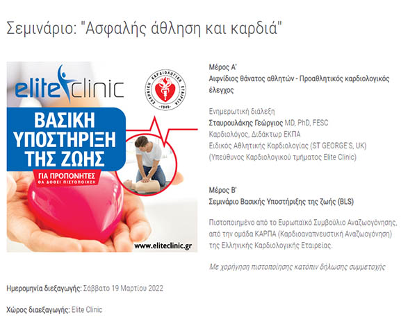 Στις 19/3/2022 διοργανώθηκε στο Eliteclinic ημερίδα σχετικά με την ασφαλή άθληση, στο πλαίσιο της οποίας δώσαμε ομιλία σχετικά με τον αιφνίδιο θάνατο των αθλητών και τον προαθλητικό καρδιολογικό έλεγχο. Στη συνέχεια διενεργήθηκε σεμινάριο με χορήγηση πιστοποιητικού ΚΑΡΠΑ (εγκεκριμένο από το Ευρωπαϊκό Συμβούλιο Αναζωογόνησης) σε προπονητές διαφόρων αθλημάτων. Το σεμινάριο ολοκληρώθηκε με επιτυχία χάρη στην ευγενική προσφορά και εξαιρετική παρουσίαση της ομάδας της Ελληνικής Καρδιολογικής Εταιρείας . Το Eliteclinic είναι ένας νέος χώρος που δημιουργήθηκε στο ΟΑΚΑ από εξειδικευμένους και έμπειρους επιστήμονες, στοχεύοντας στην ολιστική υποστήριξη των αθλουμένων, με εξατομικευμένες υπηρεσίες πρόληψης, διάγνωσης και αποθεραπείας.
