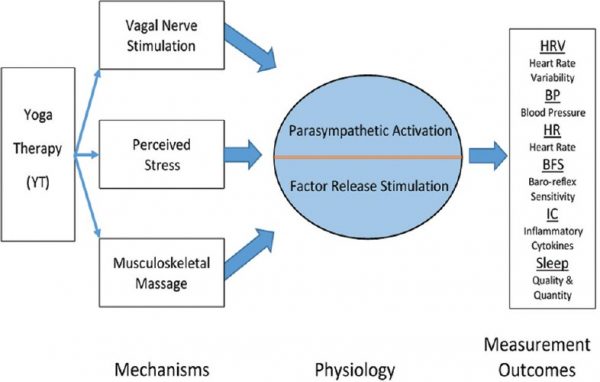 Περισσότερο από 13 εκατομμύρια ενήλικοι Αμερικανοί αναφέρουν ότι χρησιμοποιούν τεχνικές γιόγκα για βελτίωση της υγείας τους (περισσότεροι από τους μισούς μετά από σύσταση του θεράποντος ιατρού τους), ενώ περίπου το 3% του γενικού πληθυσμού στο Ηνωμένο Βασίλειο έχει ασκηθεί στο πλαίσιο της YG (Lamb, 2012, Chu et al, 2016). Σημαντικός αριθμός μελετών υποστηρίζει ότι η γιόγκα, η οποία συνδυάζει ασκήσεις αναπνοής, δύναμης, στάσης σώματος, καθώς και συνεδρίες στοχευμένου διαλογισμού, μπορεί να είναι ωφέλιμη σε ασθενείς που παρουσιάζουν χρόνιες καρδιακές παθήσεις (Kuehn, 2017). Οι μηχανισμοί μέσω των οποίων επιτελούνται αυτές οι δράσεις δεν είναι απολύτως σαφείς, από αρκετές κλινικές και πειραματικές μελέτες πάντως, φαίνεται να αποδίδεται σε τρεις βασικούς άξονες, που είναι η διέγερση του παρασυμπαθητικού, η μυοσκελετική ‘μάλαξη’ και, τέλος, η βελτίωση της αντίληψης του stress (Σχ 3).
